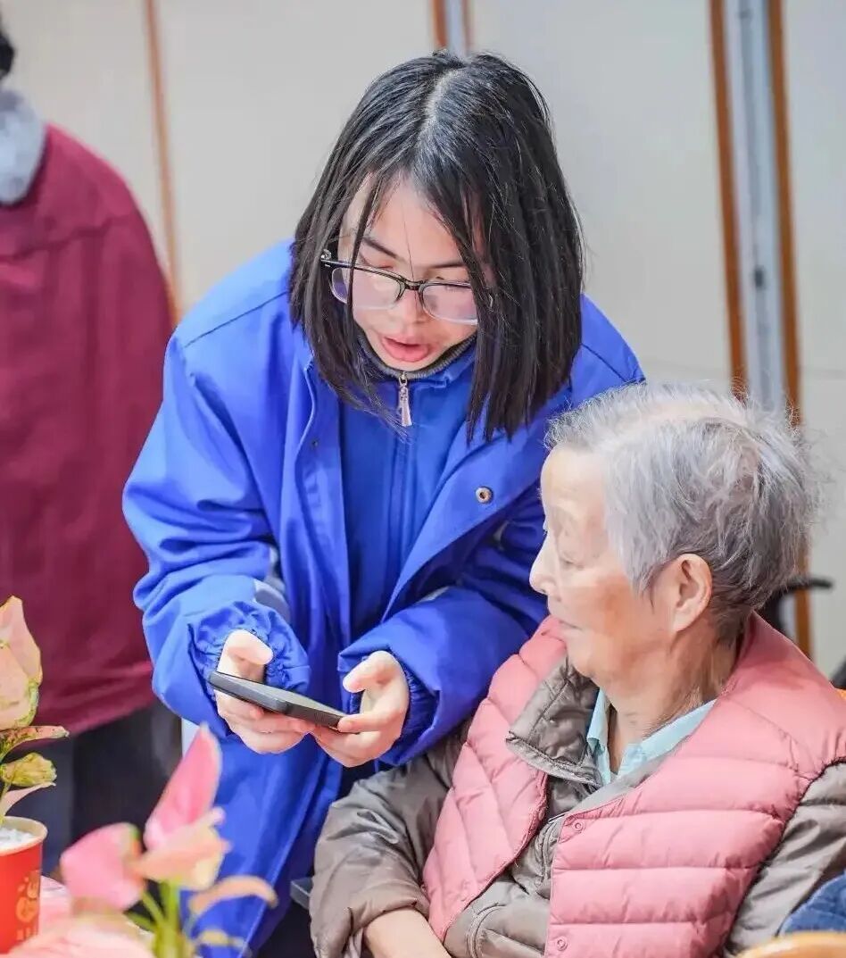 学生志愿者用AI工具为老人介绍植物