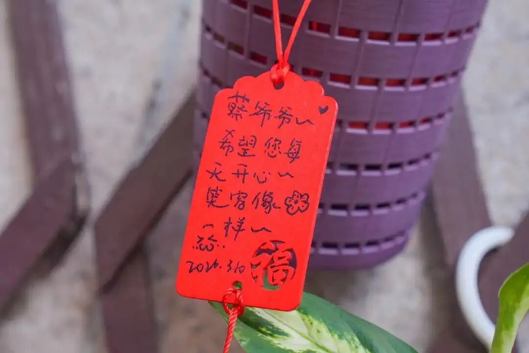 在学生志愿者的陪伴与协助下,爷爷奶奶还拿起彩笔,将心中最柔软的期盼化作文字落在心愿牌上,并郑重地系在小绿植旁。有的写下“天天开心”,有的则画上一个大大的笑脸,每一笔都饱含着对生活的热爱。
