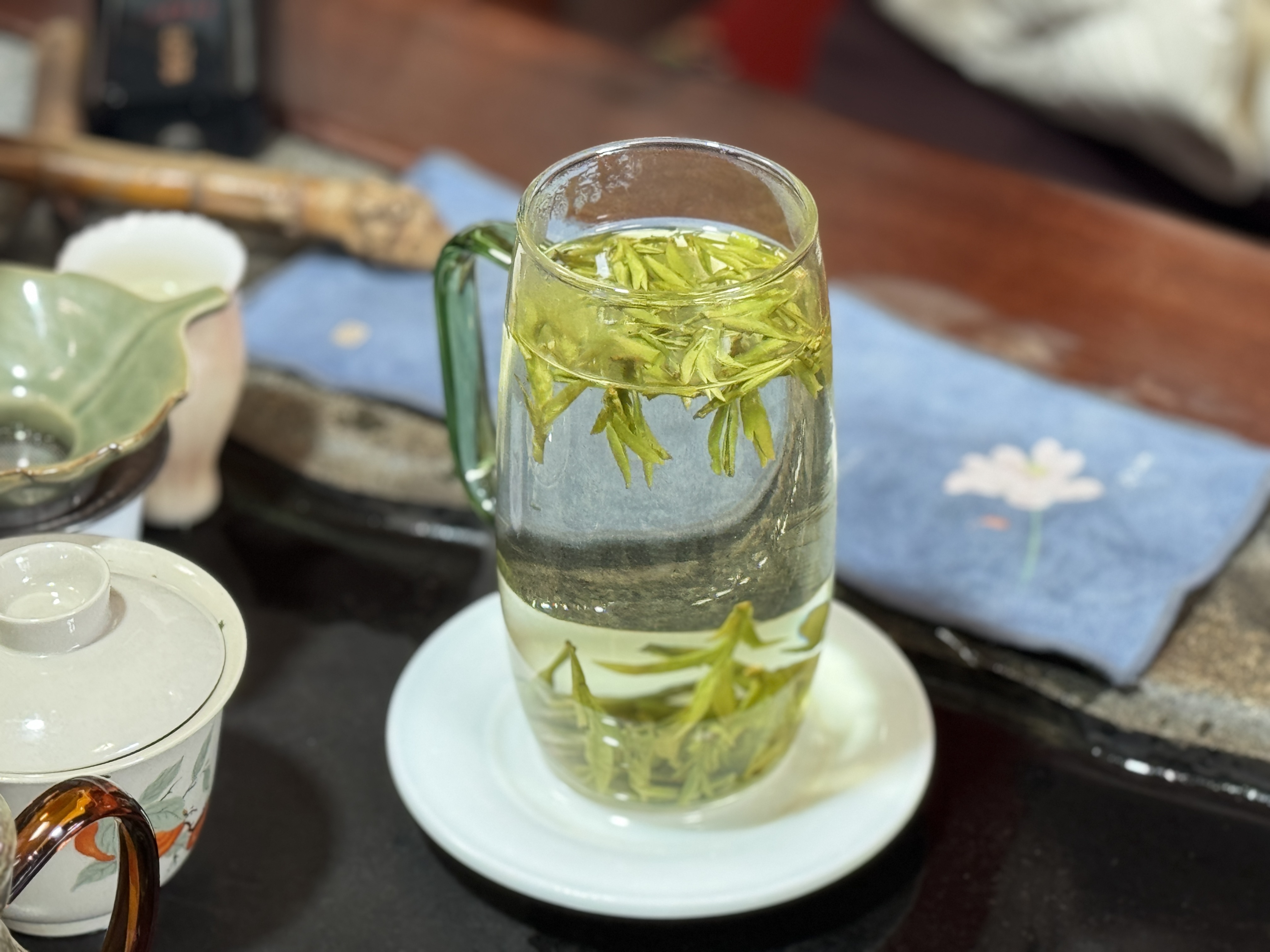 听闻新茶上市,顾女士赶到茶城品尝今年的头茬新茶。店主将沸水注入玻璃杯,一片片扁平光滑的龙井嫩芽在水中缓缓舒展,茶汤嫩绿,茶香扑鼻。“喝上去很顺滑清甜,没有那种绿茶的苦涩味道,茶香在嘴里久久不散,很好喝。”顾女士说。