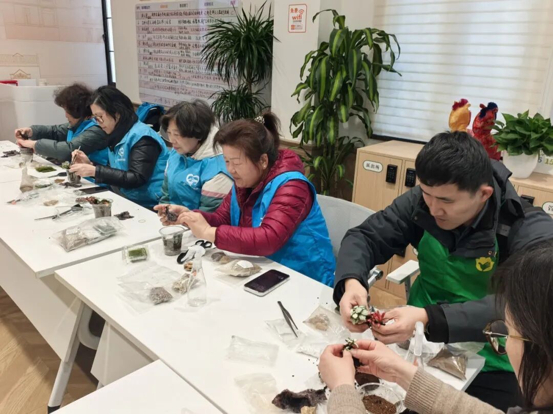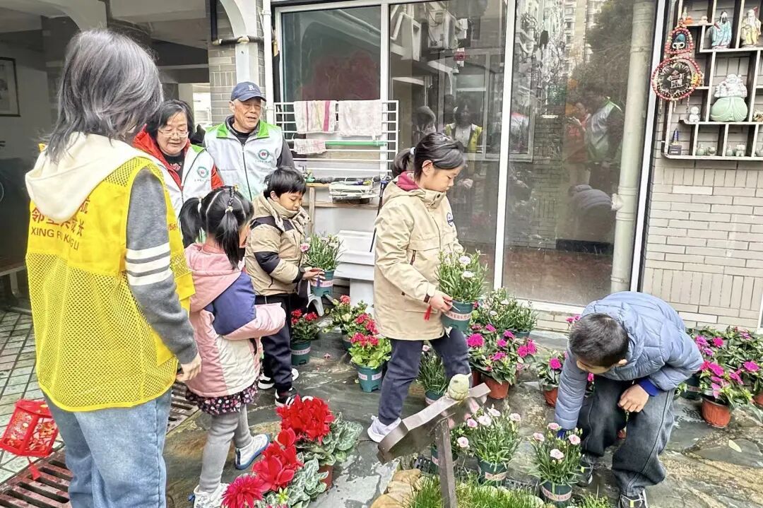 在活动分会场新福康里居民区,护绿志愿团队“幸福花匠”志愿者开设了绿植养护移动课堂,向居民讲解家庭绿植养护技巧,科普环保知识;社区还特别开辟儿童种植认领专区,让孩子们亲手栽种、认养绿植。
