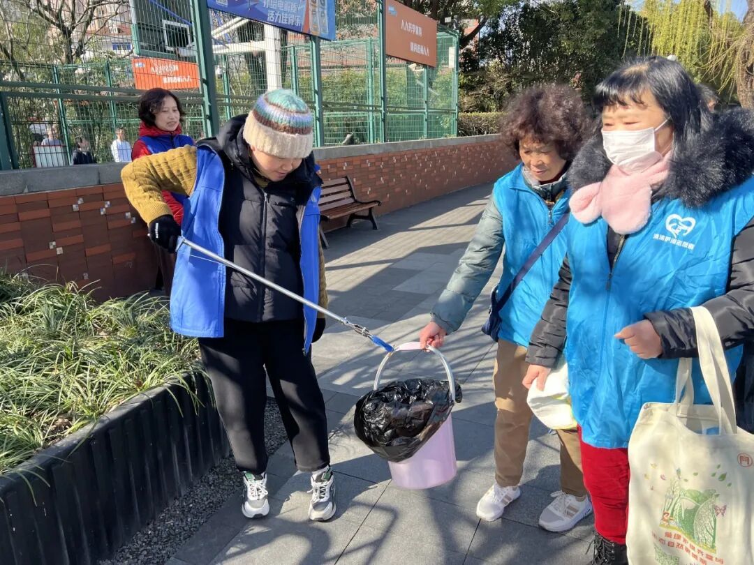 一组深入蝴蝶湾花园,细致清理绿地、卫生死角的垃圾杂物;另一组沿苏州河步道巡查,捡拾烟头、擦拭公共设施,守护水清岸绿。身穿蓝色、绿色马甲的志愿者穿梭于绿树碧水之间,成为春日里一道流动的亮丽风景。