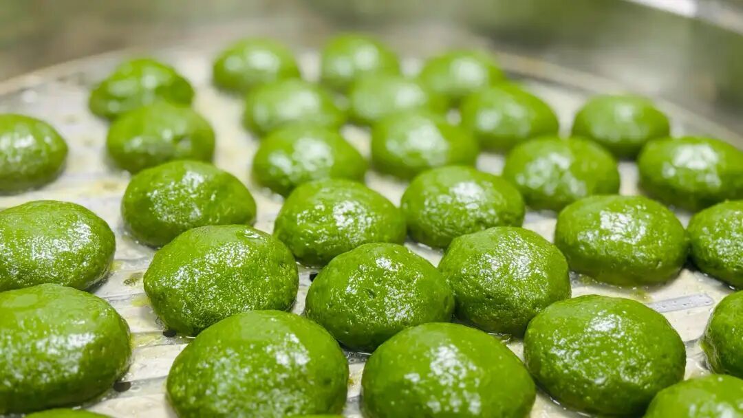 “青汁颜色太深,便有涩味;颜色太浅,青团就失了那抹翠绿。”方松餐饮副总经理闵华介绍,草汁调好后,再与糯米粉糅合成团、包入馅料,送入蒸炉蒸制,色如碧玉、糯滑细腻的青团便新鲜出炉,“全部都是当天早上现打草汁、现做现卖”。