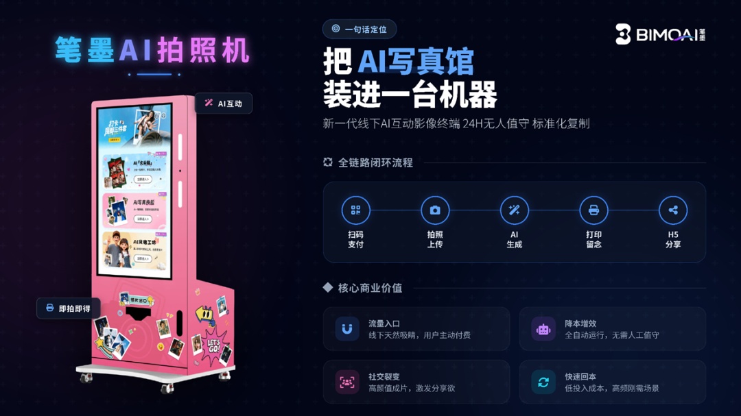 万笔千墨深耕“AIGC+文旅+消费”赛道,是一家专注于打造一站式AIGC消费者互动营销平台的高新技术企业,将带来笔墨AI拍照机。设备搭载自研多模态AIGC模型与边缘算力,集成拍摄、生成、打印于一体。