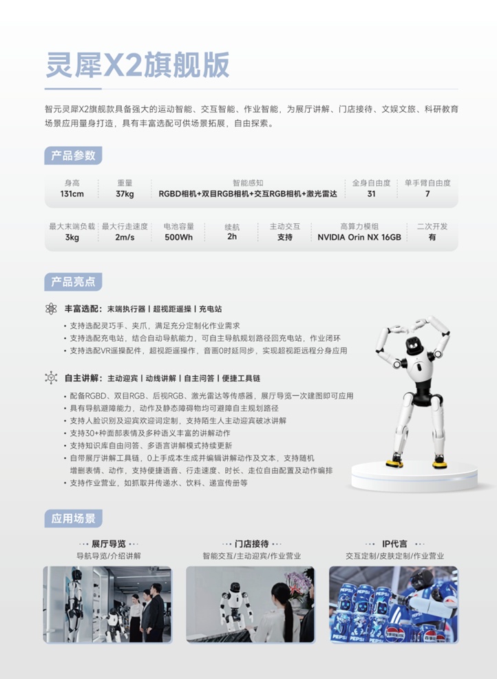 身高1.31米的灵犀X2机器人也将现身本次大会。灵犀X2支持30余种面部表情及多种语义丰富的讲解动作,能实现自然流畅的拟人交互,集运动智能、交互智能、作业智能于一身,专为展厅讲解、文娱文旅等场景打造。