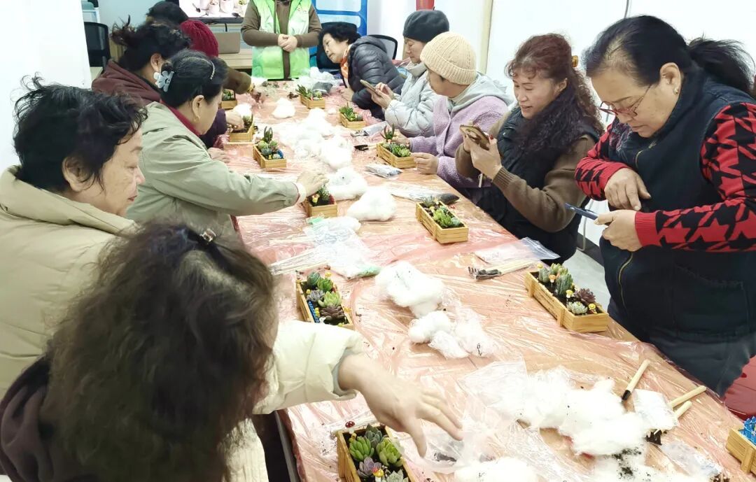 活动伊始,社区工作人员向居民详细介绍了常见多肉植物的品种特点、生长习性及日常养护技巧,并为大家逐一分发多肉植株、创意花盆、营养土、铺面石等种植材料。居民们兴致勃勃,精心挑选自己喜爱的多肉品种,在轻松愉悦的氛围中开启了创意盆栽制作之旅。