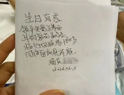 王伯伯刚进科时,病情危重,感染指标严重异常,休克征象已然显现。重症医学科医护团队在精准研判病情后,制定了周密的诊疗计划,精心部署,严密监测。在全体医护人员共同努力下,王伯伯的生命体征稳定下来,病情逐渐好转。责任护士励韵春在同王伯伯闲聊时,得知他生日将近,便同张静护士长和其他护士为王伯伯精心准备了这场生日会。生日会后,王伯伯特意写了一首小诗送给团队。