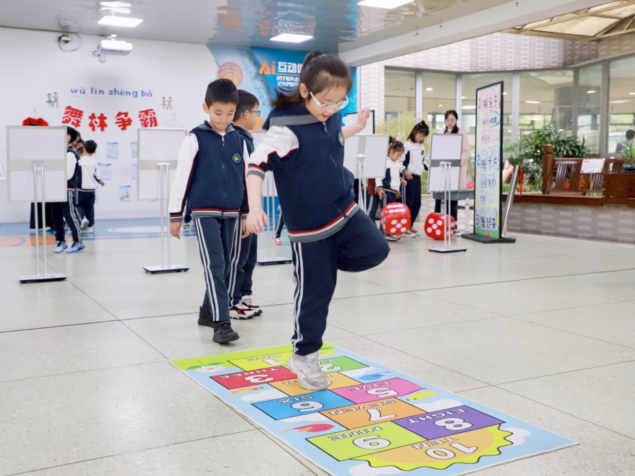 当课间调整为15分钟,学校保留了原先5个年级学生原创设计的爆款游戏,同时根据场地、器材等因素更新迭代部分的游戏活动“原本主要以年级为单位开展运动,现在,课间变长了,学生打破班级、年级的壁垒,自主选择感兴趣的项目。”苏涛说,“我们还在楼道地上贴了‘跳房子’‘手脚并用前行’等地贴,学生可以随时随地互动。”