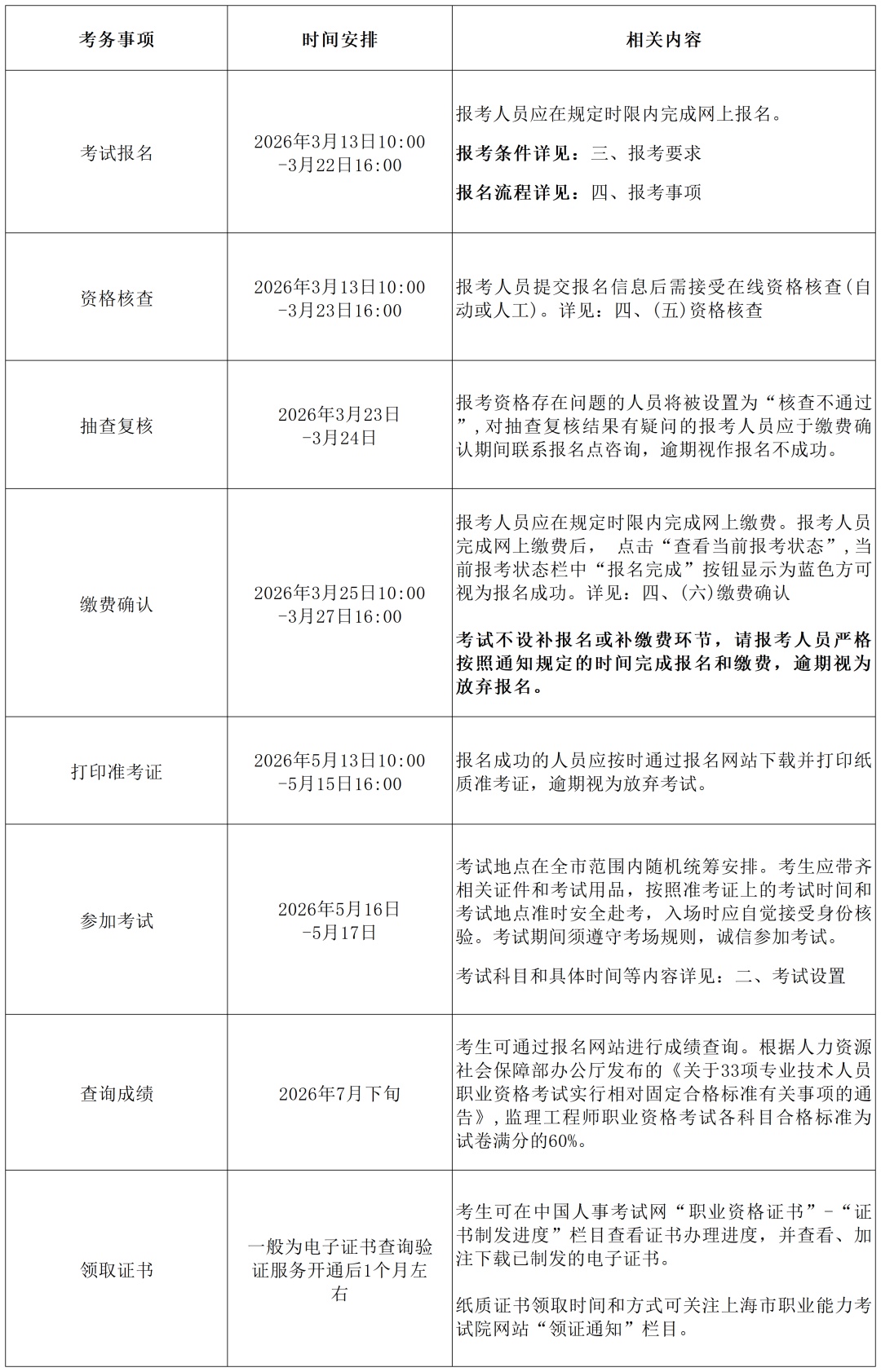 根据国家考试工作安排,结合本市实际,本市2026年度全国监理工程师职业资格考试即将开始,报考人员可于2026年3月13日10:00-3月22日16:00进行网上报名。具体操作事项详见↓