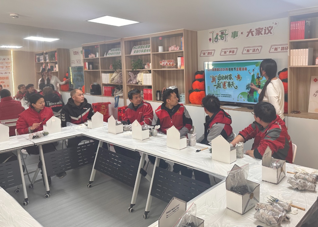春风拂绿,万物新生。3月12日,江宁路街道林长办联合宁聚·市民园艺中心在新就业群体党群服务站举办“‘新’动的树苗,一起‘递’春天”植树节主题活动,邀请辖区内快递员、外卖员等新就业群体,放下忙碌,走进这座专属“暖心驿站”,亲手栽种绿意。