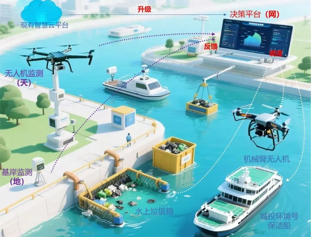 研发三类智慧适配装备:多模式无人机(巡查无人机搭载高清摄像头实时回传影像,抓取无人机配备自适应抓夹聚焦水面及滩涂零星垃圾的打捞);两栖作业船(优化辅具和强化履带设计,实现浅滩近岸高效作业);水面垃圾箱(有动力型在码头等易接电区域自动收集,无动力型利用文丘里效应及太阳能在无电区域持续工作)。三类装备通过平台智能调度,构成“巡查—抓取—打捞—收集”全链路立体作业体系。