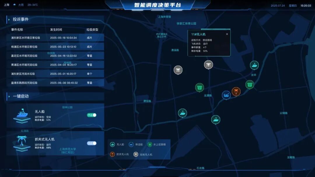 随着“一江一河”世界级滨水区建设提速,水域保洁正从“粗放型整治”向“精细化养护”转型,但三大痛点制约发展:一是感知手段滞后,问题发现依赖船巡、步巡及12345投诉信息反馈,覆盖盲区大、响应滞后,无法实现早期预警;二是调度决策缺乏科学指导,高度依赖个人经验,多采用固定路线与定期整治,缺乏对垃圾类别、数量与动态的科学研判;三是装备适配不足,现有大型保洁船适用于大规模集中整治,难以高效应对零星、分散的轻量化垃圾,响应灵活性不足反而制约保洁质量。