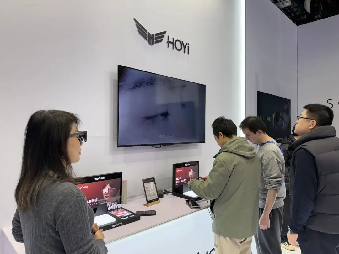 虚实融合的穿戴突破:域动锐翼携首款消费级AR眼镜HOYi Mira亮相。搭载昀光0.71英寸高性能Micro-OLED微显示器,产品以超大视场角、高清高色彩还原、低功耗等优势,实现轻量化佩戴与巨幕级观影体验的完美结合,打造“随时随地,想看就看”的移动大屏解决方案。