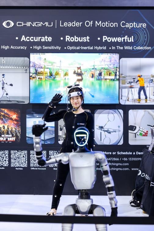 在众多前沿展品中,上海青瞳视觉科技有限公司带来的“宇数机器人(动捕方案)”成为全场瞩目的明星。其机器人以亚毫米级的捕捉精度和毫秒级的实时反馈,在动态演示中精准复现了复杂的人类动作,流畅度与精准性令人叹为观止。现场观众纷纷排队体验,亲身感受动作捕捉技术带来的神奇交互,成为展台人气最高的互动项目之一。