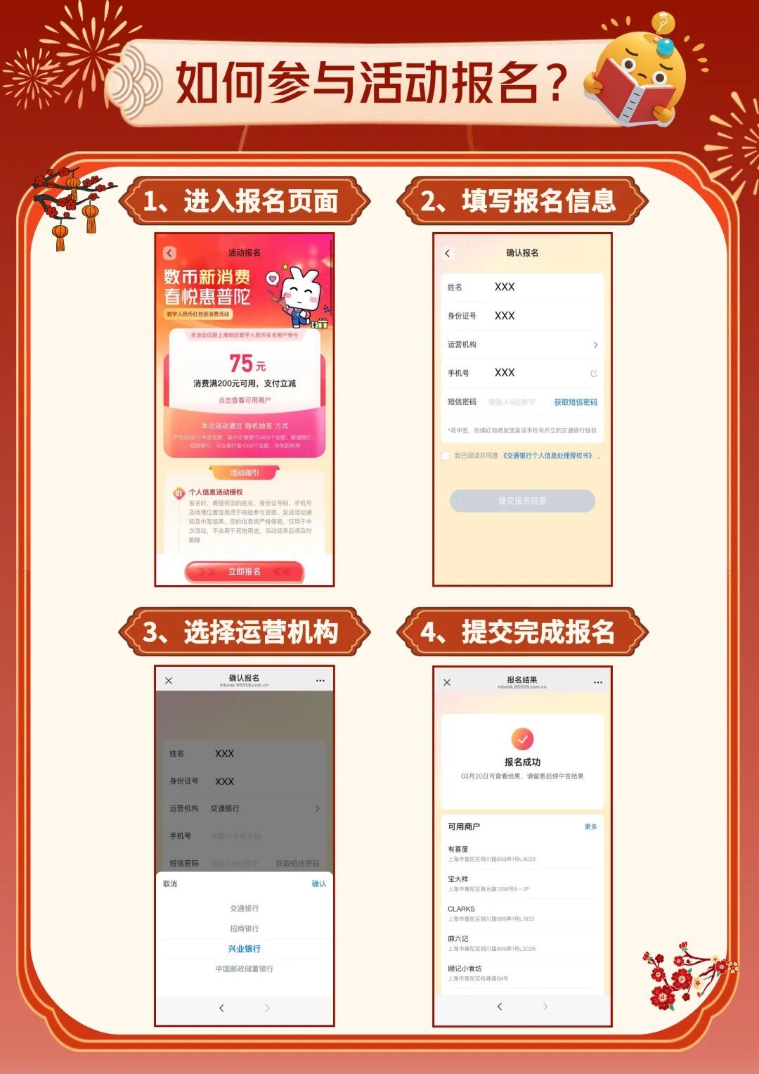 3月13日起,“数币新消费 春悦惠普陀”数字人民币红包促消费活动将正式开启报名通道,面向市民发放5000份满200减75元数字人民币消费红包,以数字消费新场景激活区域市场活力。本次活动由交通银行上海市分行、邮储银行上海分行、招商银行上海分行、兴业银行上海分行联合主办,采用“预约报名-摇号抽签-红包发放”的形式。 交通银行上海市分行相关负责人表示,此次活动是在中国人民银行数研所、中国人民银行上海总部的指导下,全国范围内多机构首次面向社会公众通过数字人民币智能合约功能,完成数字人民币红包的跨机构发放、跨机构核销运用。 报名时间为3月13日至3月17日,符合条件的市民可通过交通银行手机银行数字人民币专区、交通银行小程序首页,或通过交通银行上海市分行、邮储银行上海分行、招商银行上海分行、兴业银行上海分行微信公众号的报名入口参与报名。报名用户需满足:设备实时定位在上海市、已开通任意指定运营机构的三类及以上数字人民币实名钱包,且仅限持有二代身份证的用户参与。 摇号抽签将于3月18日-19日进行,在公证监督下公布中签结果,市民可在报名平台查询。中签用户须确保已开通报名时所选运营机构的数字人民币钱包,红包将在满足条件后发放到账,使用有效期为3月20日至3月29日。 红包仅限在普陀区参与商户使用,涵盖中海真如环宇城MAX、百联中环购物广场、真如百货、半马苏河文创空间等商圈及参与活动商户。支付时,用户使用对应数字人民币钱包的付款码或“扫一扫”功能,满200元即可自动抵扣75元红包。 便民信息: (一)市民朋友扫描二维码,在报名页面四家银行渠道中任选一家报名一次即可,无需重复报名或多渠道报名。 (二)此外,用户中签后,最晚须在3月28日前开通报名时所选运营机构的三类及以上实名钱包,否则中签红包将视为自动放弃。 (三)活动细则请识别二维码后查看。 报名二维码