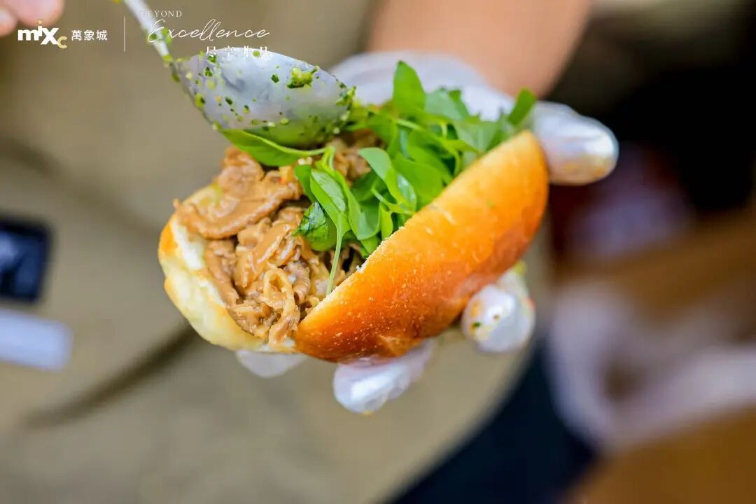 郑州荆芥肥牛米法棍,昨天晚上从郑州空运来的食材,现烤现做,闻着味道就可以找到摊位的程度。