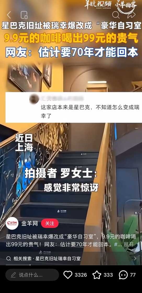 消息一经出现,“到花园洋房上自习”这一话题就迅速登上热搜,网友们纷纷发出感慨:“上海实在是太有都市感了,就连瑞幸都开始营造小资情调了,”。遭到了众人的围攻,瑞幸制定了新的店规,把有插座的桌子设定为自习区,要是超过四个小时的话,就得重新点单。