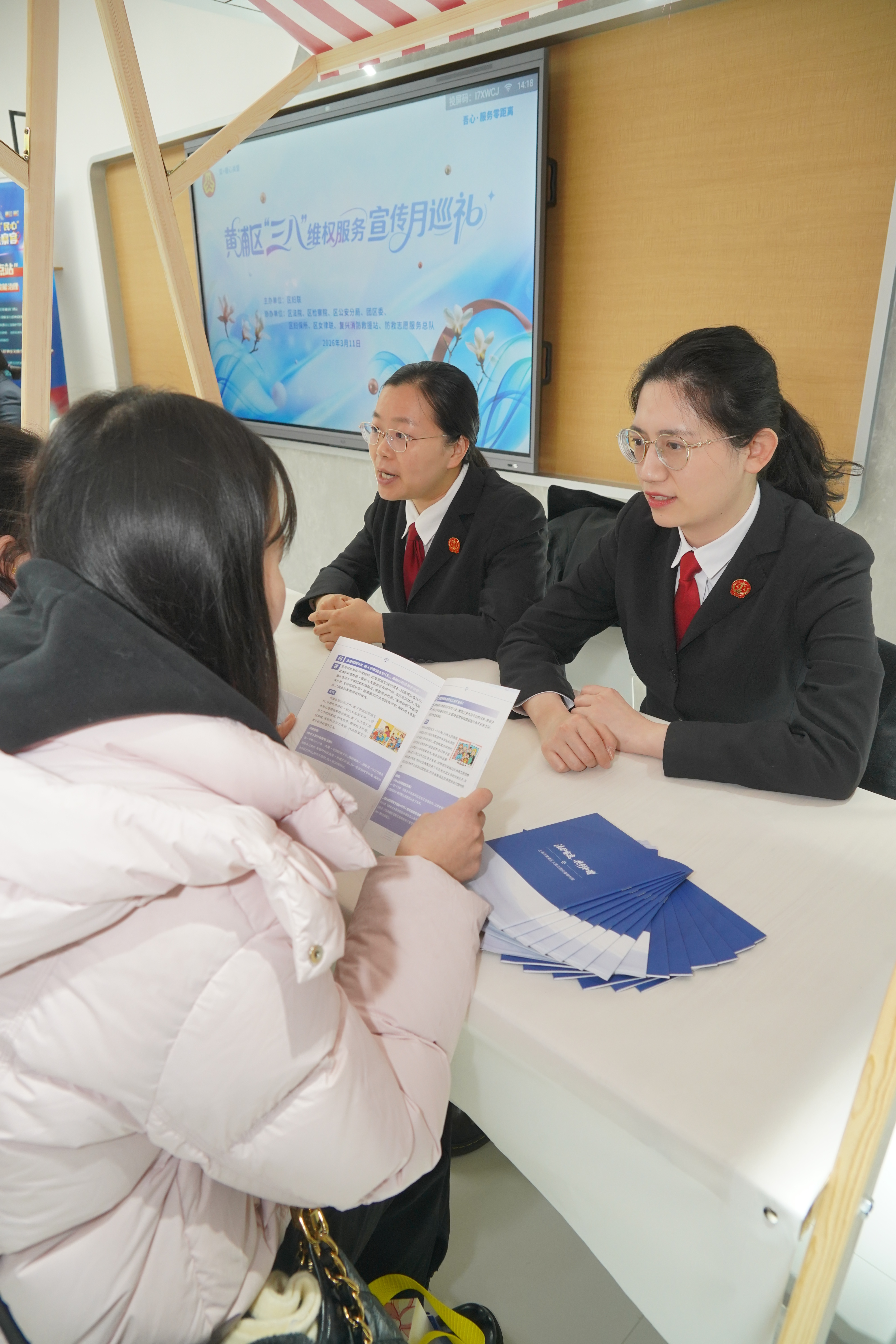 3月11日,黄浦区12338妇联维权服务中心迎来了首场活动——黄浦区“三八”维权服务宣传月巡礼。区妇联携手区法院、区检察院、区公安分局、团区委、区妇保所、区女律联、复兴消防救援站、防救志愿服务总队等单位,围绕“法援护航”“职场赋能”“身心关爱”“综合服务”等主题,为黄浦妇女群众打造维权服务矩阵。