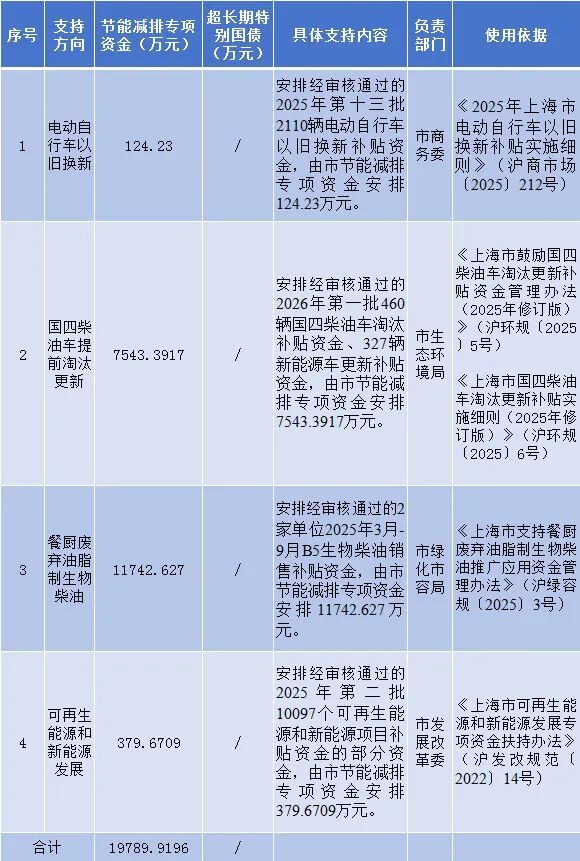 上海市2026年节能减排专项资金和超长期特别国债安排计划(第四批)发布啦!支持方向为电动自行车以旧换新、国四柴油车提前淘汰更新、餐厨废弃油脂制生物柴油、可再生能源和新能源发展,计划下达市节能减排专项资金19789.9196万元,详见↓