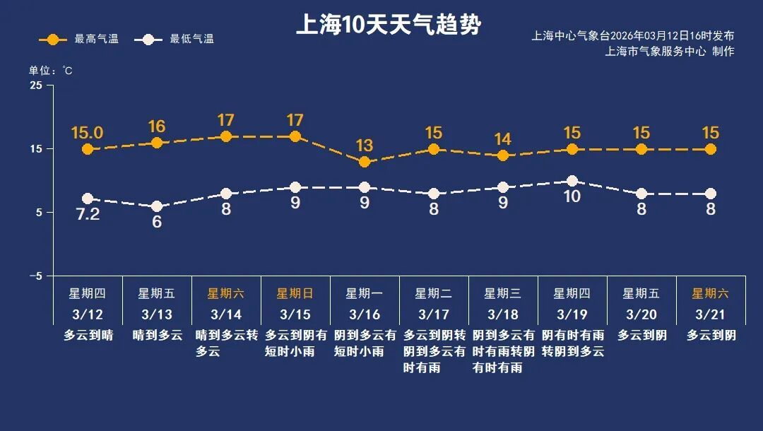 3月14日(周六):晴到多云转多云,8~17℃