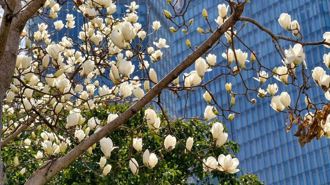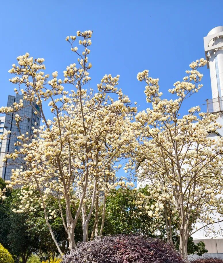 这里的玉兰树长势繁茂,满树繁花如雪,无叶遮挡,枝桠舒展,极具视觉冲击力。广场开阔、视野极佳,玉兰树分布均匀,有的独立成景,有的簇拥绽放,花瓣洁白饱满、质感通透,既能近距离赏玉兰、闻花香,也能远眺广场钟楼与来往人流。