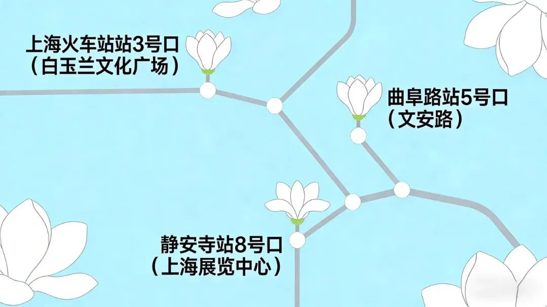 地铁1/3/4号线上海火车站站3号口出站,步行170米即达白玉兰文化广场,交通超级便捷,无论是途经换乘,还是专门来赏花,都十分省心。