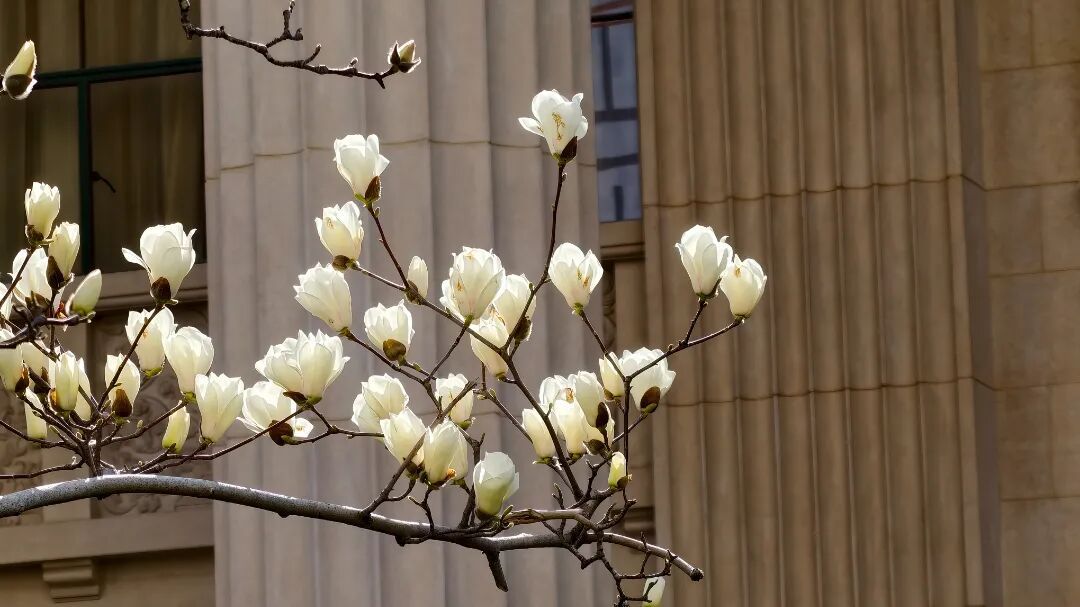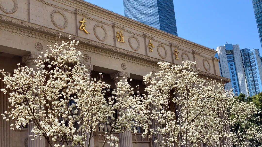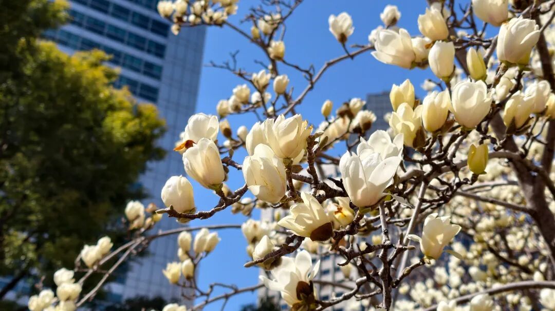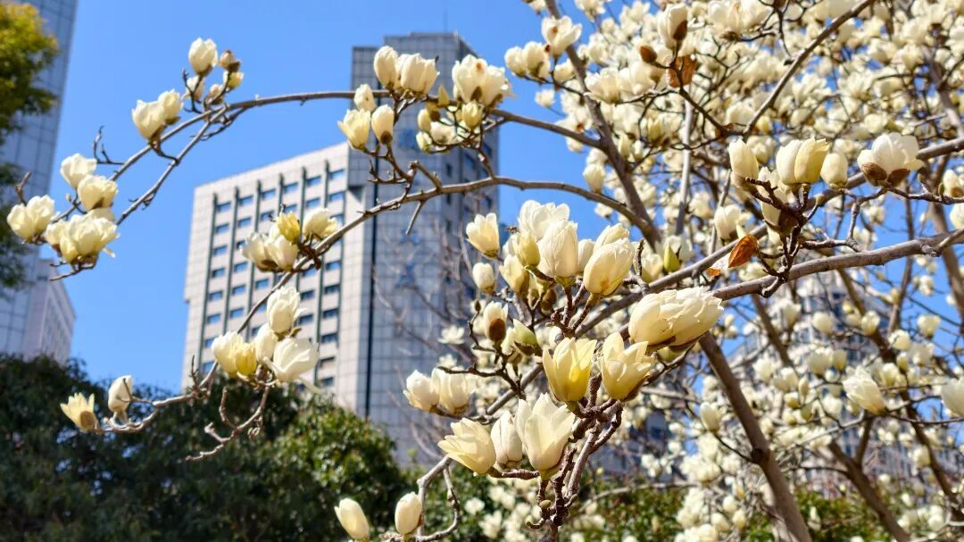 这里的白玉兰主要分布在靠近上海展览中心3号口的西花园,以及南京西路友谊会堂前。上海展览中心前身为中苏友好大厦,俄罗斯古典主义风格的米黄廊柱、鎏金尖顶,与洁白莹润的白玉兰相映成趣,风过花影轻摇,花瓣飘落于廊柱之间,香气清浅,自带静谧诗意。