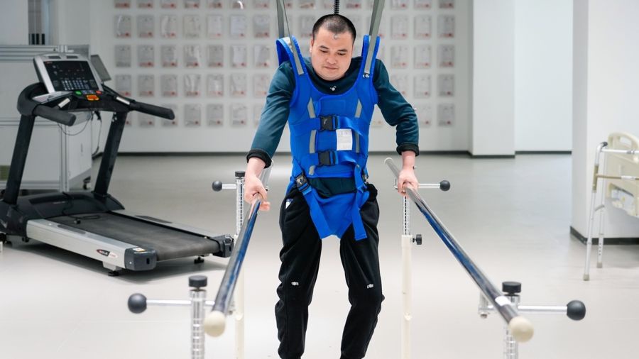 全国首例脑脊接口受试患者小林在进行康复训练