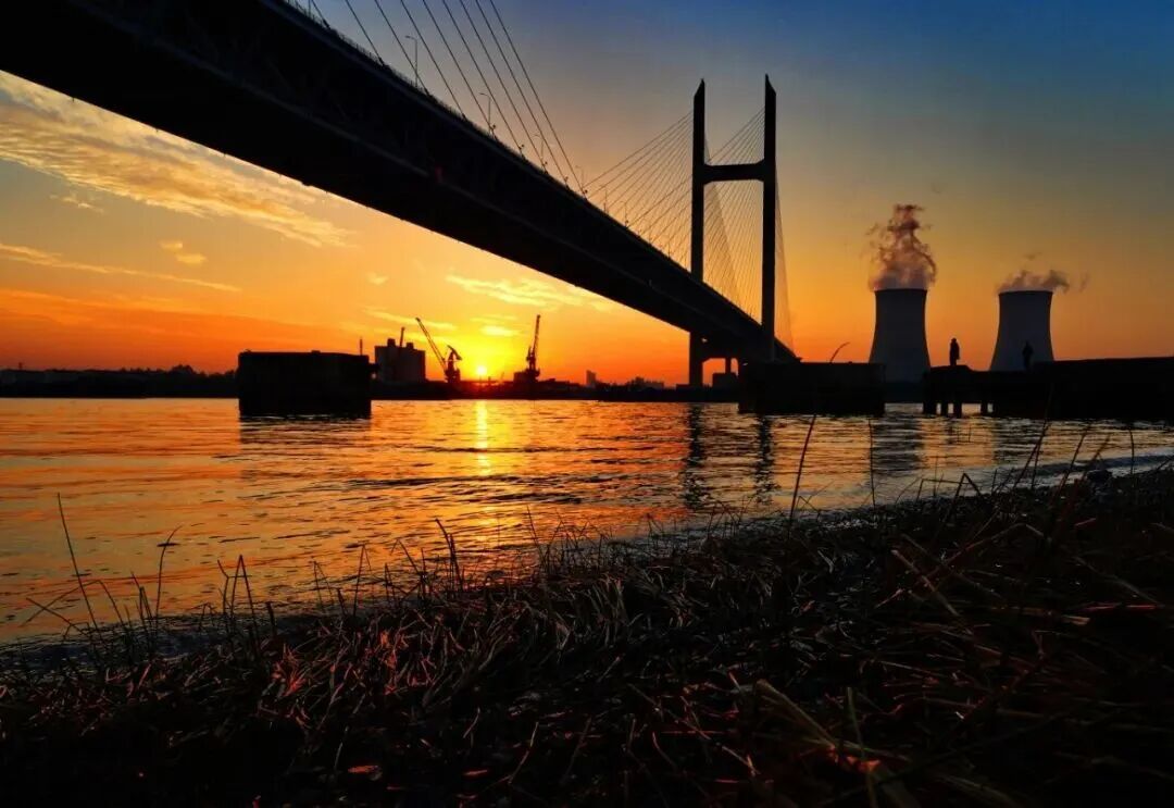闵浦大桥在暮色中勾勒出硬朗的轮廓,江风轻拂,轮渡缓缓驶过,落日、大桥、江水交织成绝美画卷。