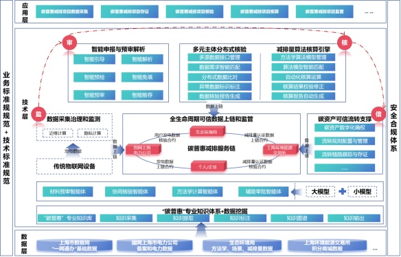 上海2023年出台《上海市碳普惠管理办法(试行)》,2024年3月发布1MW及以下分布式光伏发电碳普惠方法学。分布式光伏碳普惠项目具有项目数量多、单个项目年减排量小、传统第三方核查成本高等特点。为鼓励光伏项目积极参与碳普惠减排量申报,需简化申报流程、降低申报难度、提升审核质量和效率,同时还需确保数据准确可靠。该项目融合物联网、区块链、OCR技术,打造“审-核-监-信”一体化可信管理平台:前端以OCR、隐私计算、规则引擎简化申报、自动核验数据;后端通过交叉验证模型实现数据比对、异常预警,为生态环境局、管理部门及金融机构提供全量感知、事中预警、智能溯源服务,确保碳数据真实可信。