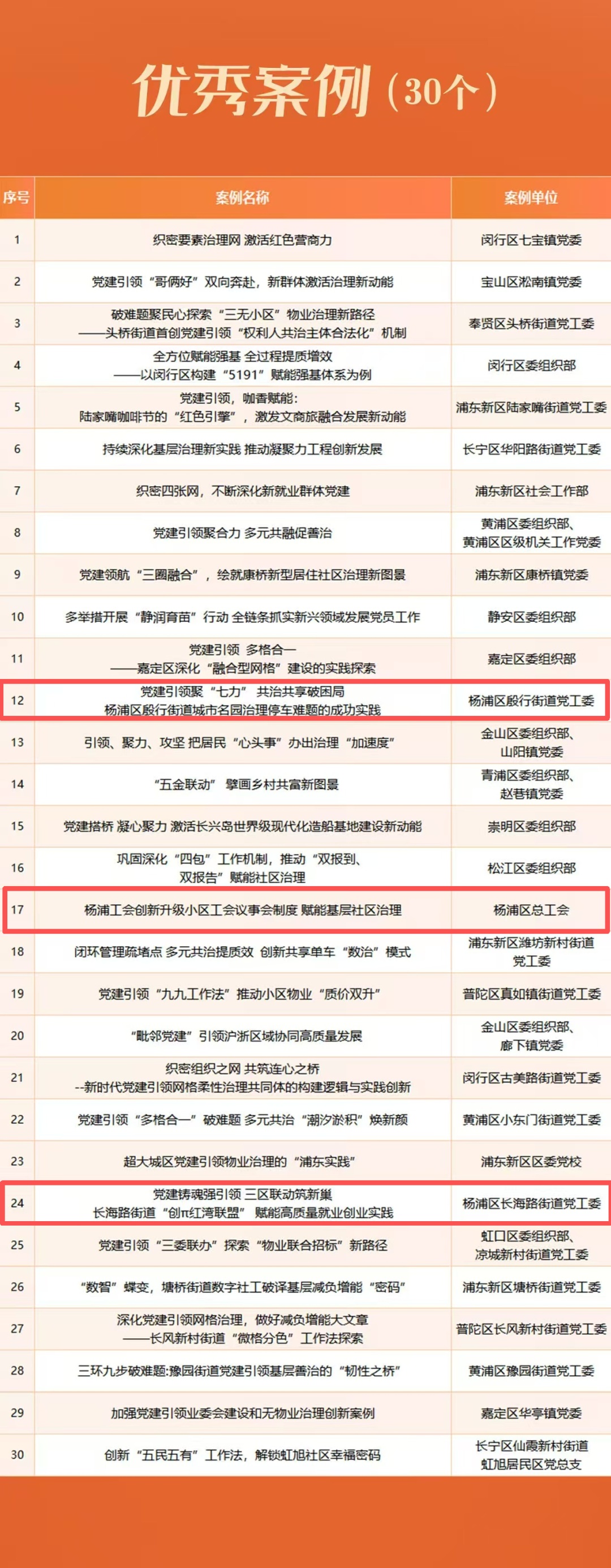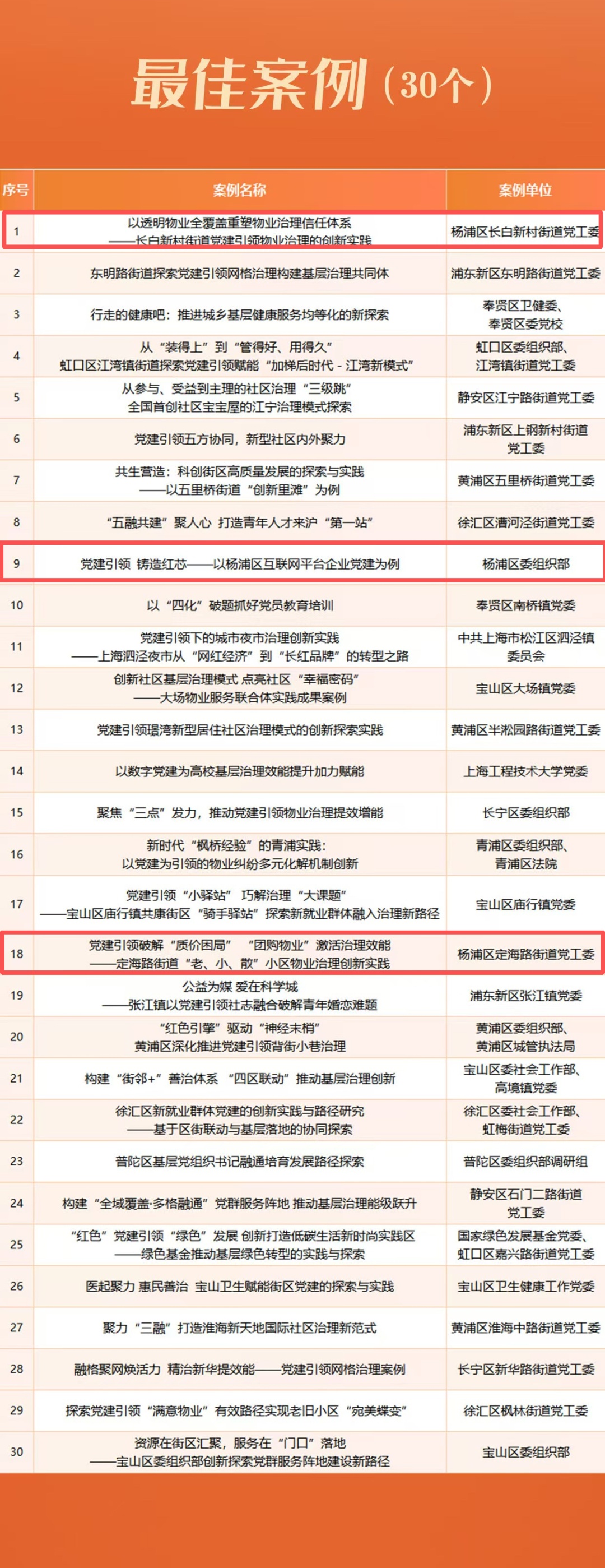 此次评选有100个具有代表性和可复制性的案例脱颖而出,其中最佳案例30个、优秀案例30个、入围案例40个。本次征集活动历时近一年,共收到申报案例近500个,多维度、多视角,持续展示上海党建引领基层治理新成果,广泛汇集全市基层党组织的经验和智慧,提炼党建引领基层治理新模式,推动党建引领基层治理新发展,为上海“人民城市”建设助力。