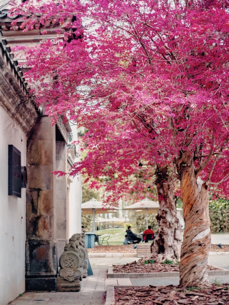 市文化和旅游局介绍,上海的春天,正被一棵棵绝美的树悄悄点亮。延春公园、古藤园、陶家宅、兴国宾馆、豫园、世博文化公园里一树一景,一步一画,这些藏在城市里的春日精灵,正在或即将用极致浪漫,惊艳整个上海的春天。 图_小红书@Rionida 每年暮春时节,杨浦延春公园就会迎来一年中最富诗意的时刻。素有“镇园之宝”美誉的杜梨树绽放出如雪繁花。 每当公园东南角的“杜梨王”进入盛花期时,高逾8米的伞状树冠上,万千白花织就成一片片流动的云锦。 一簇簇洁白无瑕的杜梨花,在春天里显得格外清新雅致,浪漫至极。 花梗在微风中轻颤,漫天“飞雪”浪漫至极。 地址:杨浦区营口路20号 参考花期:3月底至4月上旬 在闵行区江川路街道临沧路上的古藤园内,有一株沪上最古老的紫藤,距今有490多年的历史。 园内以古紫藤为植物主景,园内围绕池塘建有亭、桥、廊、榭、楼阁等仿古建筑,勾勒成一幅江南庭院美景。 每逢4月紫藤花盛开满园飘香,是不可多得的打卡胜地。 地址:闵行区临沧路148号 参考花期:4月 图_小红书@Rionida 位于浦东新区川沙王桥路999号的陶家宅,是一座始建于1908年的古宅,曾是清末儒商陶长青的故居。 图_小红书@Rionida 如今,这里是一尺花园的陶家宅1号店。宅院两侧的两棵红花檵木,已被浦东新区列为古树名木,见证着古宅的百年变迁。 图_小红书@Rionida 4月,会迎来红花檵木盛放期,绯色云霞蒸腾,搭配白墙黛瓦,中式美学令人叹为观止。 图_小红书@Rionida 地址:浦东新区川沙王桥路999号陶家宅1号 参考花期:4月 图_小红书@Rionida 古香樟生长在兴国宾馆大草坪的一隅,与之相望的是一栋欧式二层楼的宫廷建筑,香樟浓郁的绿色配上建筑物纯洁的白色,映衬蓝天白云,这一场景无不让人遐想,使人静谧。 粗略测量,此古香樟“胸围”达5.4米,而冠幅足有26米。香樟浓郁的绿色搭配周围精致洋楼建筑,格外美丽。 地址:长宁区兴国路78号 眼下,在豫园的点春堂旁,一株编号0896的古树,作为上海古树名木中独一份的茶梅,亦是豫园内唯一的名木,正以满树琼花,在冬日里绽放着时光淬炼的美好。 这株茶梅又名秋芍药、富士之峰,是珍贵的白色重瓣品种。豫园白墙青瓦间,这株古茶梅如约迈入盛花期,预计持续至正月底。 满树洁白重瓣的花朵层层舒展,饱满莹润宛若仙子凌波,淡雅清香萦绕古建回廊。 地址:黄浦区福佑路168号 参考花期:至正月底 正在世博文化公园举办的奇花艺境展,首阶段以垂枝梅为主题,以其空前规模与独特形态,突破传统赏梅模式,运用中国园林造景手法,实现“一梅一景、移步换景”的意境。 有一棵植株高达三层楼的垂枝梅王。花开时节,万千花朵由上至下盛放,宛如一树倾泻的流苏飞雪,视觉效果极为震撼。 眼下,垂枝梅已经进入落花期,想要欣赏的话需要抓紧时间。 地址:世博文化公园世界花艺园 参考花期:即将结束