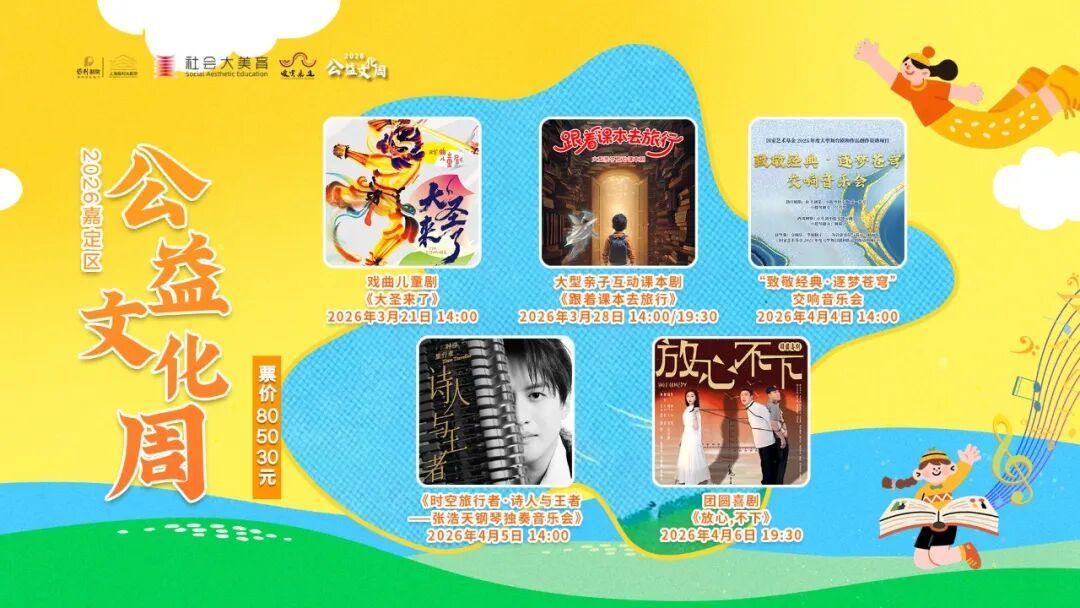 现场,2026嘉定区公益文化周系列演出揭幕,3月21日至4月6日期间,将带来5台6场演出,涵盖儿童剧、课本剧、戏曲、音乐会、喜剧等多元剧种,依旧延续30/50/80元惠民票价,让大家花小钱看大戏,尽享公益文化福利。