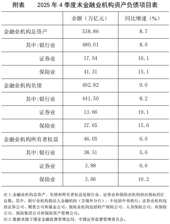 初步统计,2025年4季度末,我国金融业机构总资产为538.86万亿元,同比增长8.7%,其中,银行业机构总资产为480.01万亿元,同比增长8.0%;证券业机构总资产为17.54万亿元,同比增长16.1%;保险业机构总资产为41.31万亿元,同比增长15.1%。