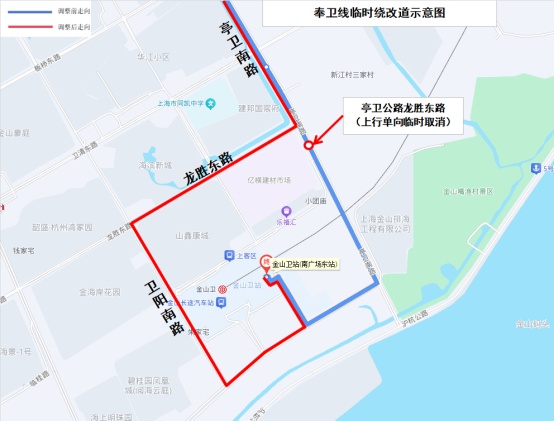 绕行走向:上行:无影响。下行:自卫宏路金山大道始发经卫宏路、金山大道、西静路、板桥西路、东平南路、卫清西路、卫零路、沪杭公路、卫一路、金一东路、新城路、大堤路、柳城路、蒙山路、沪杭公路、戚家墩路、隆安路、隆安东路、同凯路至金山卫站。