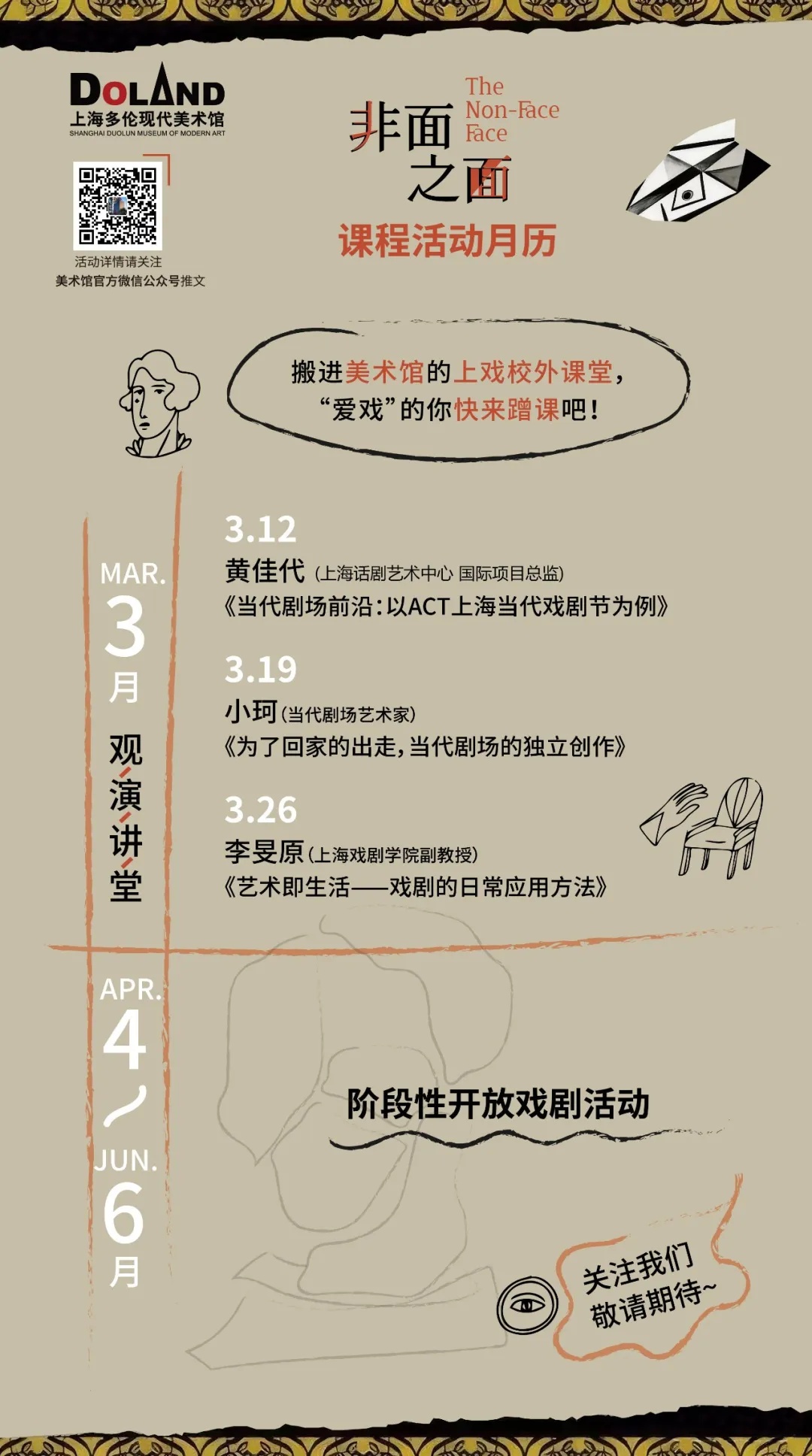 3月12日,“非面之面”——上海多伦现代美术馆与上海戏剧学院戏文系《剧场理论与实践》馆校合作课程项目启动。该项目打破传统课堂边界,将戏剧教学搬进美术馆,以“人脸”为核心,融合当代戏剧与前沿艺术的理论与实践,为公众呈现多元艺术体验。