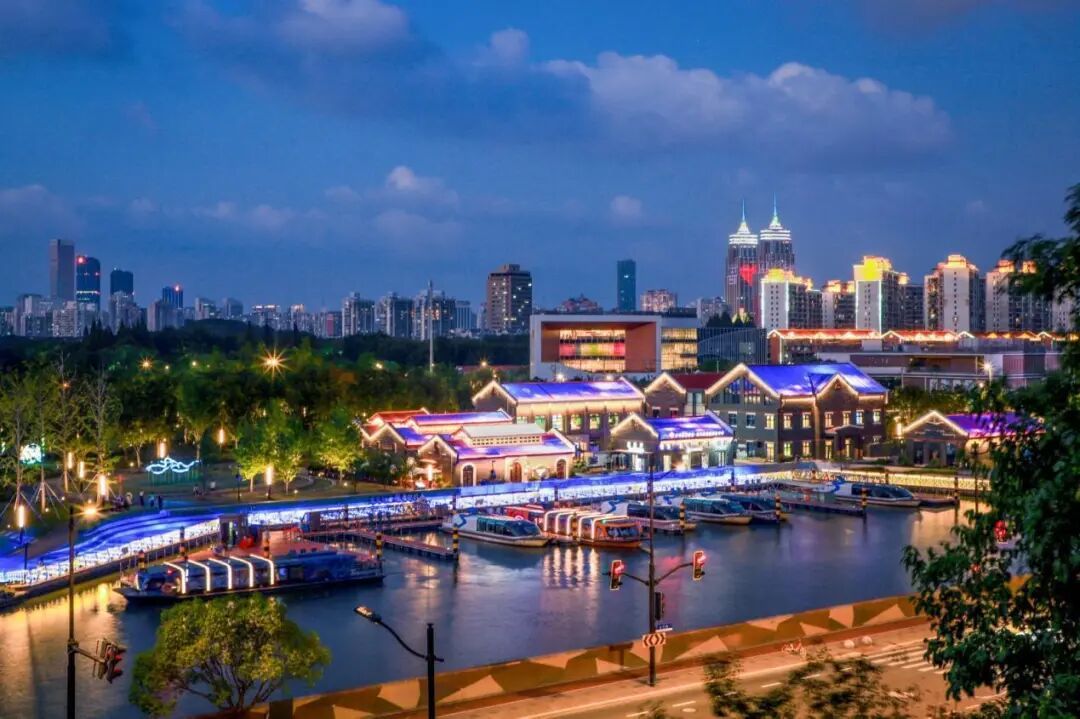 暮色浸染,长风公园码头在河畔铺展成画。河水泛着微光,游船静静停靠,船身灯带流转。岸边建筑错落,蓝紫灯光勾勒轮廓,与远处城市高楼的灯火呼应。绿树在旁,路灯洒下暖黄,晚风轻拂,吹皱河面光影。漫步于此,看码头、建筑、河景相融,长风公园码头的夜,藏着静谧又绚烂的烟火。