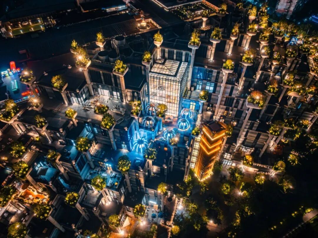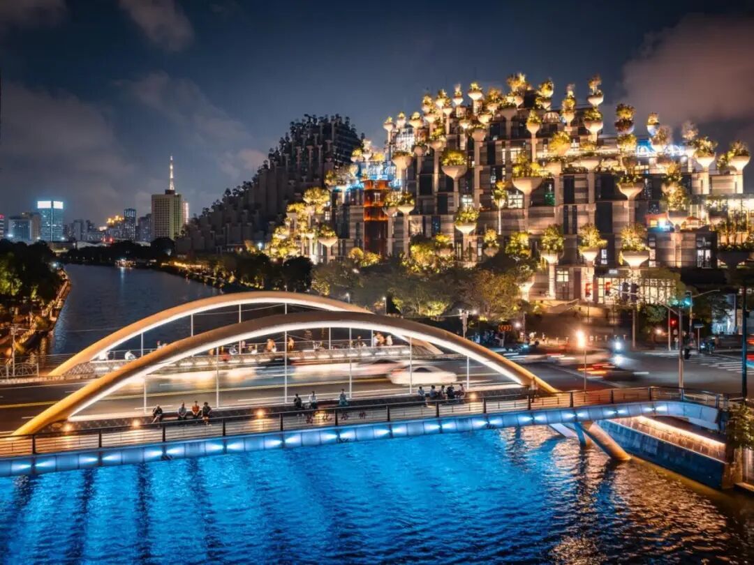 暮色渐浓,苏州河如蓝绸带流淌,天安千树似“空中花园”拔地而起。桥梁横跨河面,车流拖曳光带,桥栏蓝光与河水交融。建筑周身,绿植花钵缀着暖黄灯火,与对岸城市天际线的微光呼应。漫步桥边,晚风裹着草木香,看水光、灯影、建筑交织,这方夜景,藏着苏河独有的浪漫烟火。