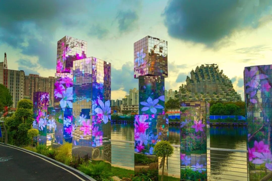 暮色漫染,潘家湾的镜面立柱成了光的画布。紫蓝繁花在镜面流淌,与河水的粼粼波光呼应,远处建筑轮廓隐于天际,树影、灯影、花影交织,漫步这幻彩河畔,晚风裹着光影的浪漫,每一眼都是潘家湾独有的夜之诗。