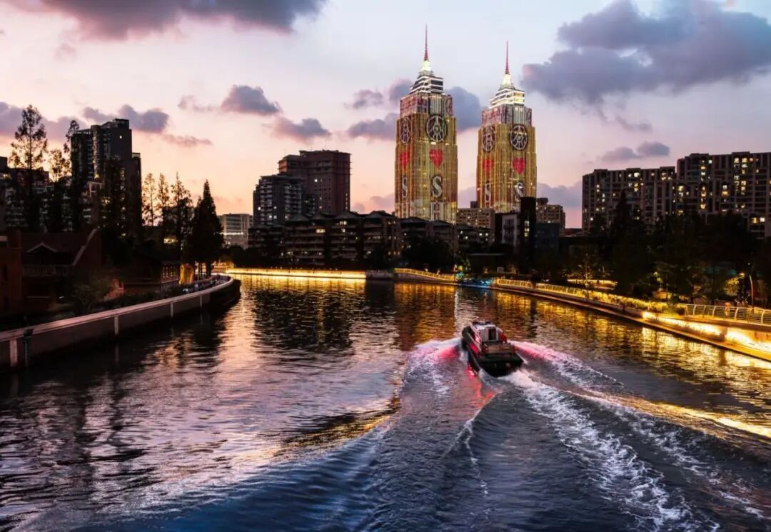 暮色漫染天际,苏州河泛着粼粼波光。一艘小船破浪前行,尾迹在河面拖出银白的线。对岸,环球港双子塔闪耀着暖金光芒,塔身的图案在暮色里清晰又醒目。沿河的灯带勾勒出两岸轮廓,高楼与民居错落,灯火次第亮起,和天空的粉紫晚霞相融。漫步在这,晚风裹着河水的气息,看船行波荡、塔影流光,苏河与环球港的黄昏,藏着城市最温柔的烟火。