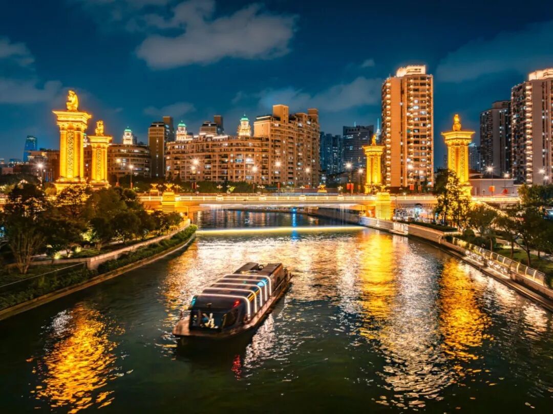 夜幕下,苏州河静静流淌。一艘游船在河面上行驶,船身的灯光在水波里晃出光影。河上的桥亮着暖黄的光,桥边几根高大的柱子也被照得金黄,顶端的雕塑清晰可见。桥后面,一幢幢高楼透出暖光,窗户里的灯火和城市的路灯、景观灯融在一起。