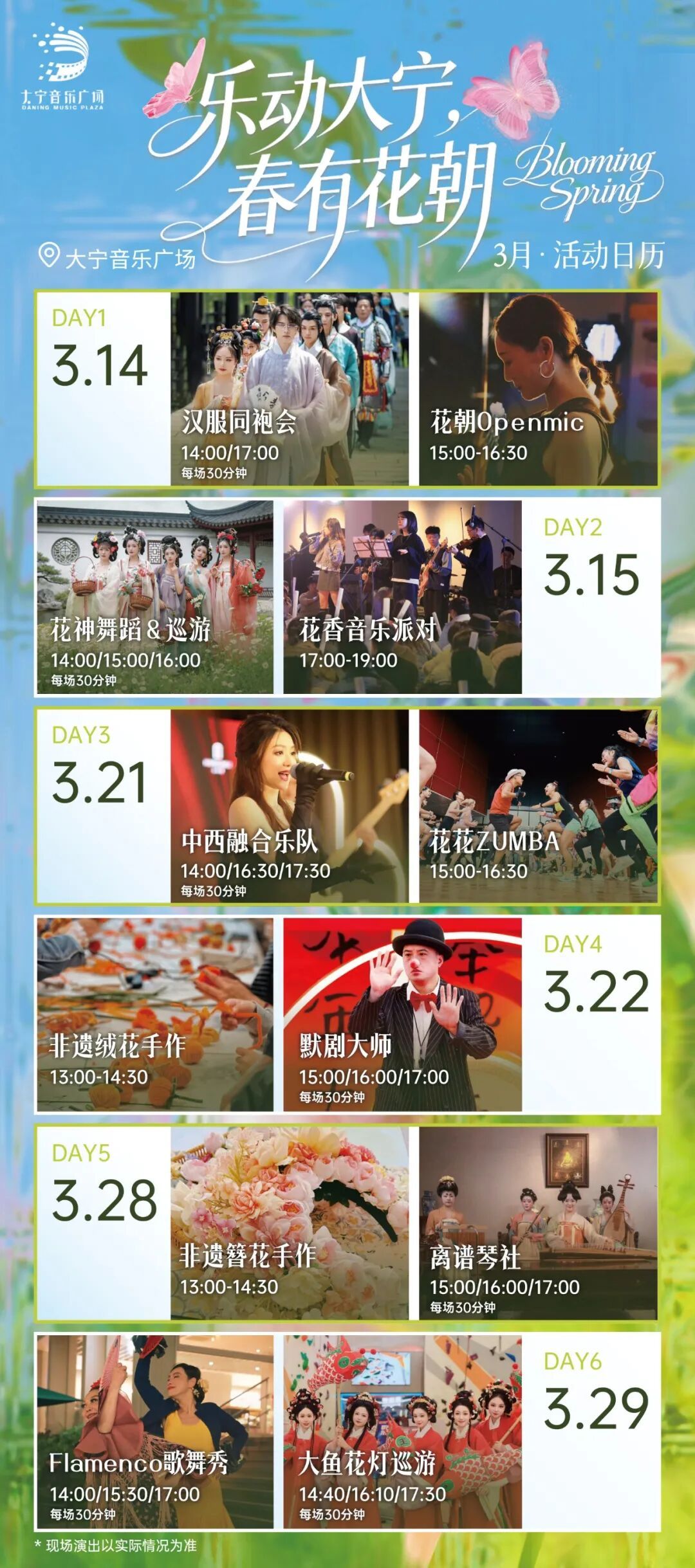 在本次花朝节期间,中西融合乐队、花花ZUMBA、Flamenco歌舞秀、大鱼花灯巡游等近20场活动也将每周末在大宁音乐广场上演。