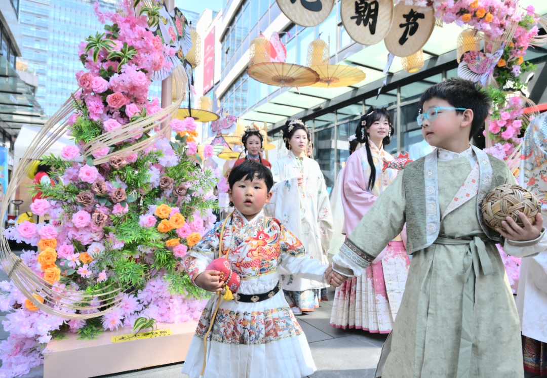 首场汉服同袍会准时开启。50名汉服爱好者身着各式传统服饰,从广场中央款款而行,开启集体国风巡游。曲裾深衣的庄重、齐胸襦裙的飘逸、圆领袍衫的飒爽……这幅“移动的汉服画卷”穿行于现代商业空间,吸引众多市民驻足拍照。