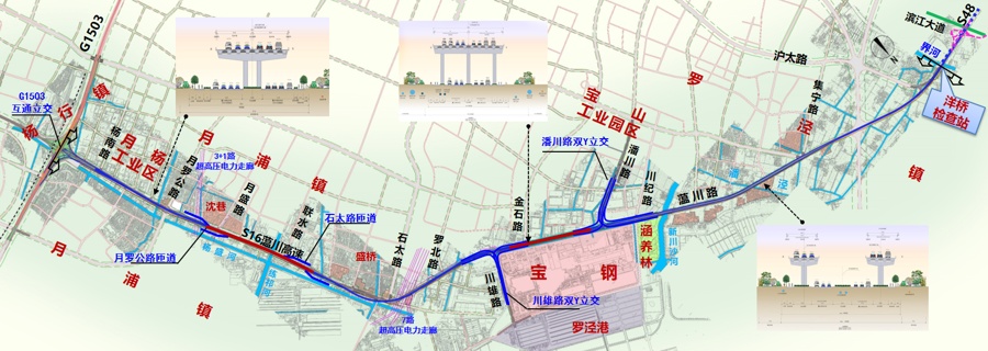 S16蕰川高速新建工程全线位于宝山区,南起G1503公路-蕰川路立交,北至沪苏省界,衔接S48沪宜高速。工程采用“高架主线+地面辅道”敷设方式,于G1503公路-蕰川公路节点处设置T型互通式立交,在川雄路和潘川路设置“双Y型”立交出入口,在月罗公路北侧和石太路南侧设置平行匝道出入口。S16公路高架主线为高速公路,双向6—8车道,设计速度100公里/小时—120公里/小时;地面蕰川公路为一级公路,采用公路城镇段建设标准,双向4—6车道,设计速度60公里/小时。论对外辐射能力和战略意义,S16蕰川高速的重要性尤为突出。城投公路第三事业部第二指挥部总工介绍,项目建成后,将构建北部出省高等级通道,强化沪苏联通,促进长三角一体化高质量发展;与沿江通道共同组成沿江沿海大通道,为国际航运中心建设及沿江沿海产业带发展提供有力支撑;加强沿线重点片区与中心城区的快速联系,进一步优化产业片区出省交通需求,大力促进宝山“北转型”发展。