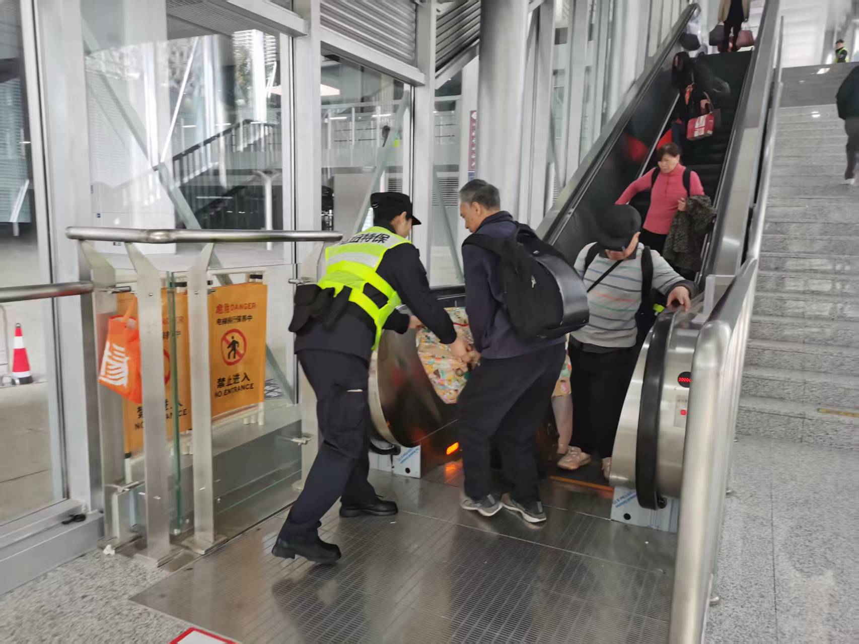 2月2日,春运大幕正式拉开。清晨6点的上海松江站,天刚蒙蒙亮,旅客已陆续涌入,空气中满是归乡的期盼。免安检通道内,於林同早已身着制服,全神贯注地紧盯着往来人流与运行设备,不敢有丝毫懈怠。突然,一阵急促的惊呼声打破了有序的节奏:一名约60岁的女性旅客在搭乘自动扶梯时,随身携带的行李箱不慎滑动,她下意识去拉,瞬间失衡,整个人重重摔倒在运行的扶梯上。