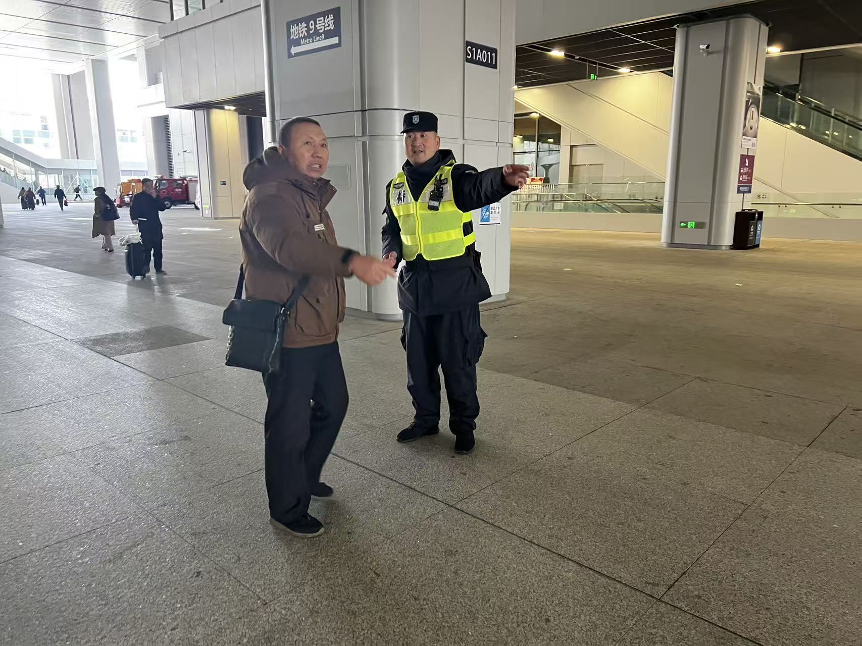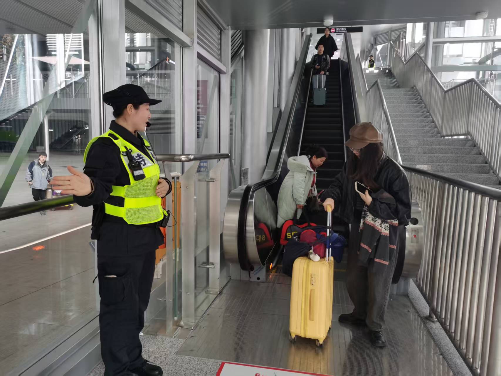 如果说於林同的温暖藏在危急时刻的挺身而出,那么闫艳的温情,则体现在细微之处的主动担当。2月21日,春运返程高峰来袭,松江站内旅客骤增,到处都是拖着行李、步履匆匆的身影。下午4点多,闫艳正在免安检通道外围巡逻,一名独自出行的旅客陶女士主动上前问路,语气中带着几分焦急。闫艳停下脚步,耐心细致地为她指明转乘路线,说话间,她注意到陶女士的难处:独自一人的她,肩上背着大包小包,手里还拖着一个塞得鼓鼓囊囊的大蛇皮袋,每走一步都十分吃力。