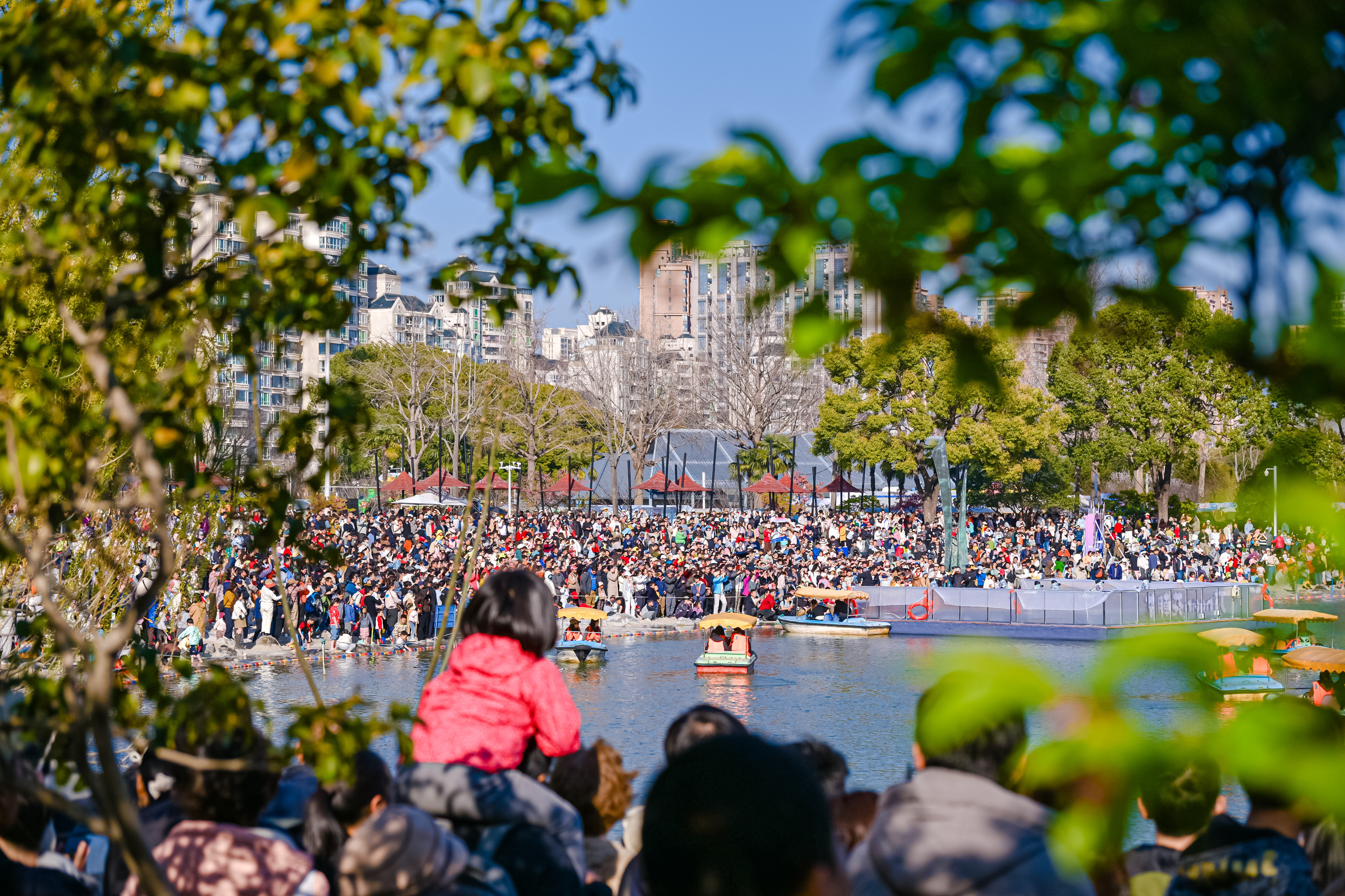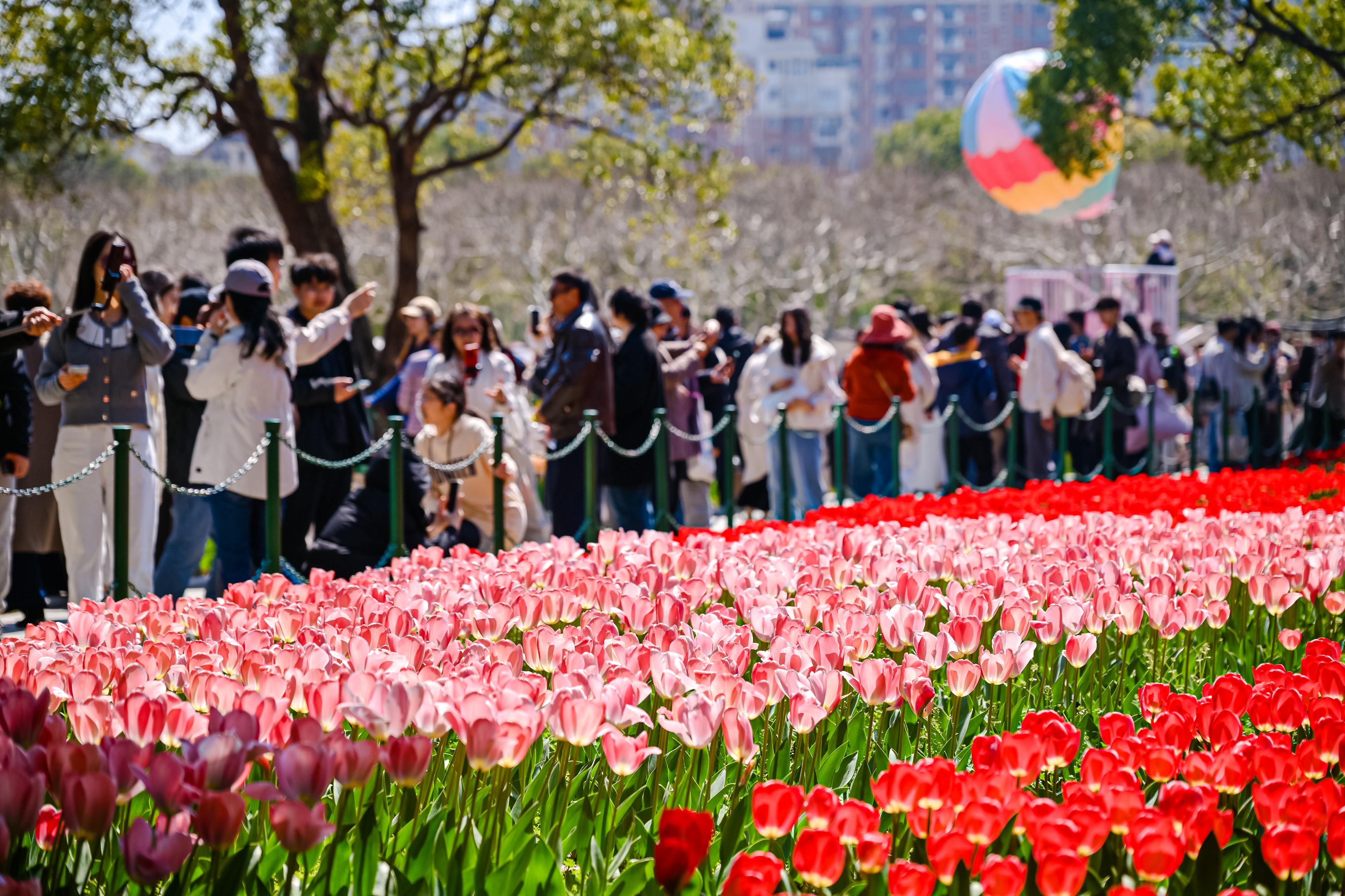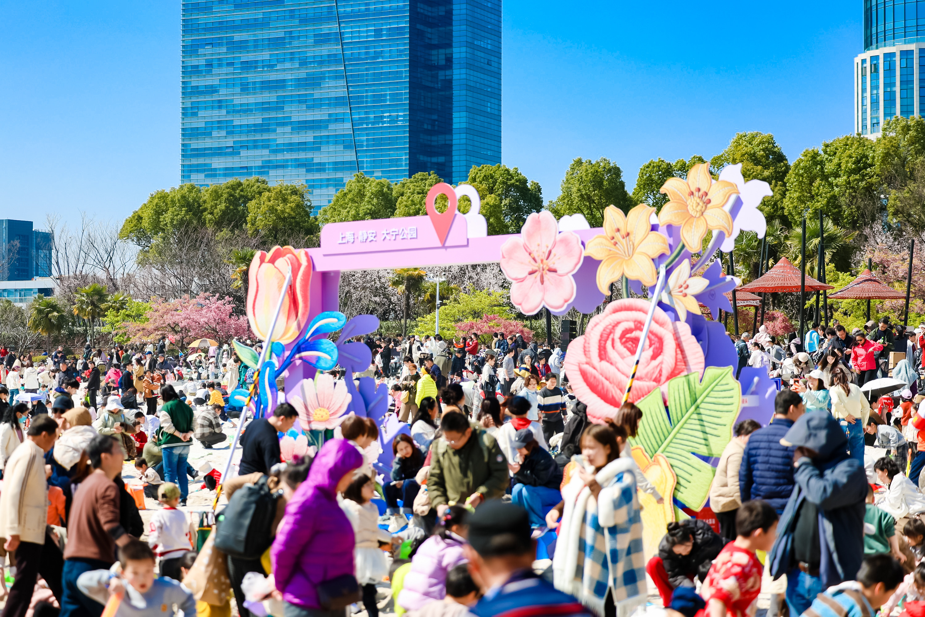 经统计,在晴好天气的加持下,截至花朝节开幕首日下午三点十分,大宁公园单日客流峰值已突破10万人次,最大在园人数突破5.2万人,创近年新高。
