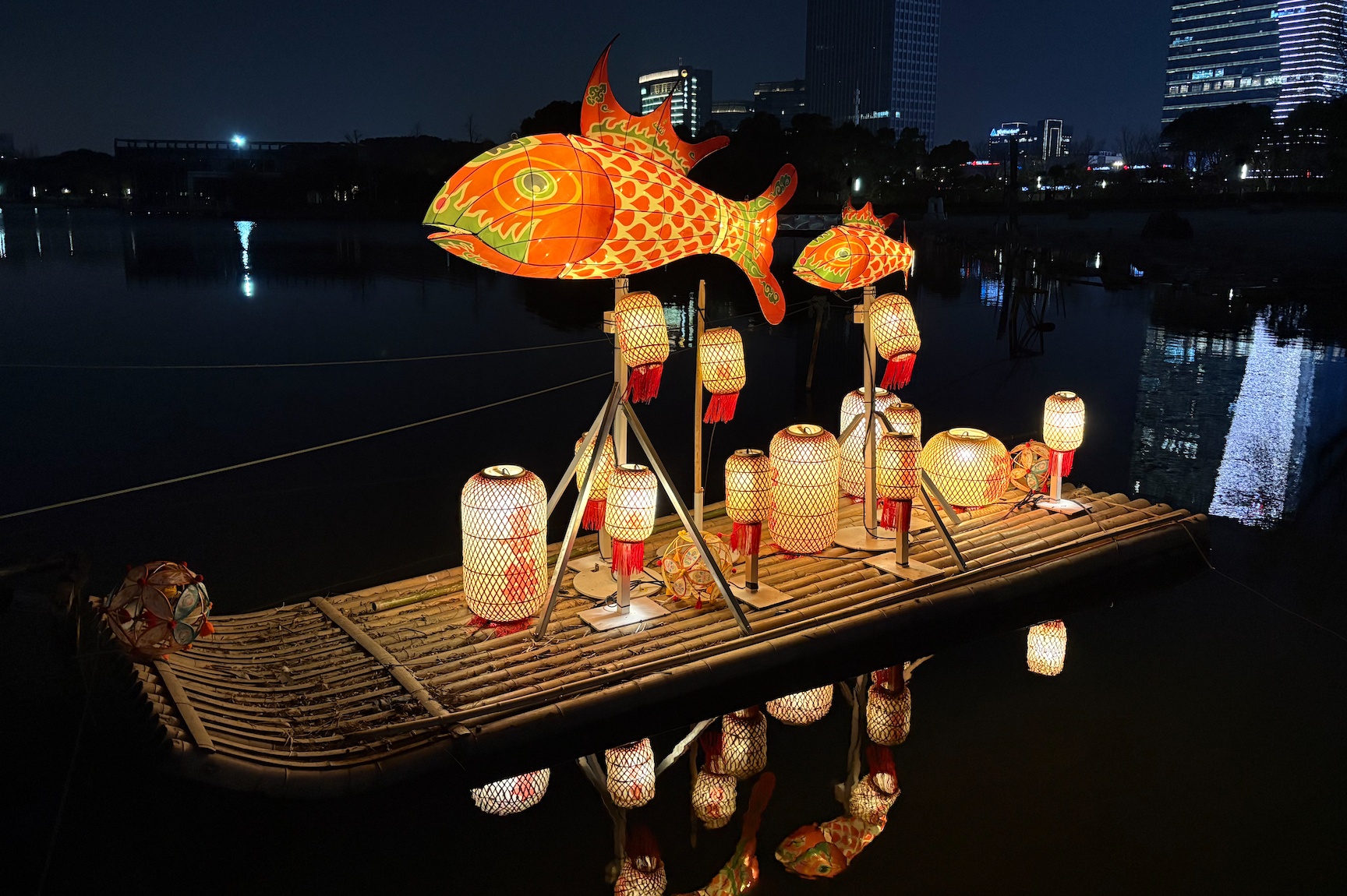 从北门的花墙画框到白沙滩的“风”字秋千,从鱼灯摇曳的凉亭竹筏到毛线针织的树上花束,从石阶楼梯的蘑菇装置到船坞港湾的巨型花路,从月亮湾的扭扭棒烟花到南国风光的治愈系诗歌——步步皆景,处处可游。