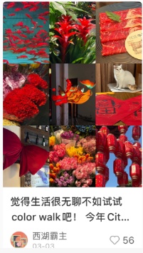 最近,社交媒体上一种特别的散步方式火了——Color Walk。玩法很简单,出门前,在心里预先选择一种颜色,带着这个目标走进寻常的街道,在行走中主动寻找、捕捉这种颜色并拍下照片。许多人在行走后觉得非常治愈:原来,我们忽略了寻常风景里那么多隐藏的小美好。