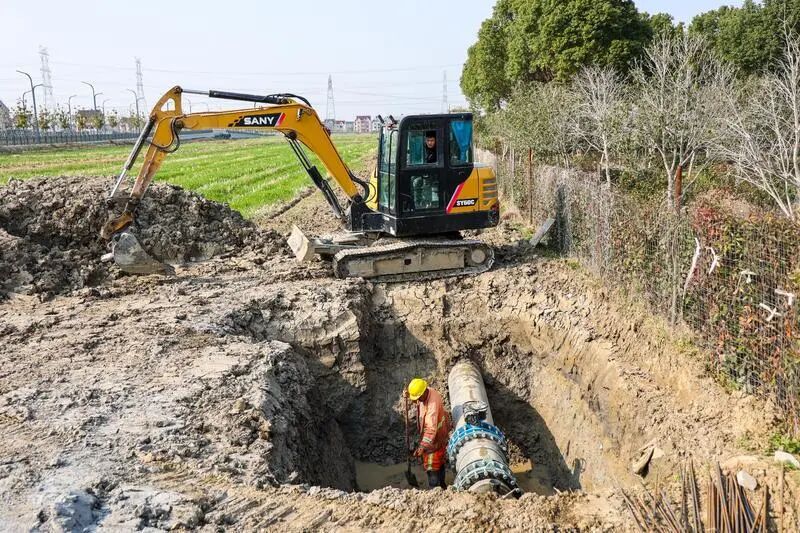春日的枫泾镇五一村,高标准农田建设现场一派热火朝天。挖掘机伸展长臂,在田间穿梭作业,沟渠开挖的轰鸣声此起彼伏。工人们紧随其后,对新挖的沟渠细致平整,分工协作、干劲十足。
