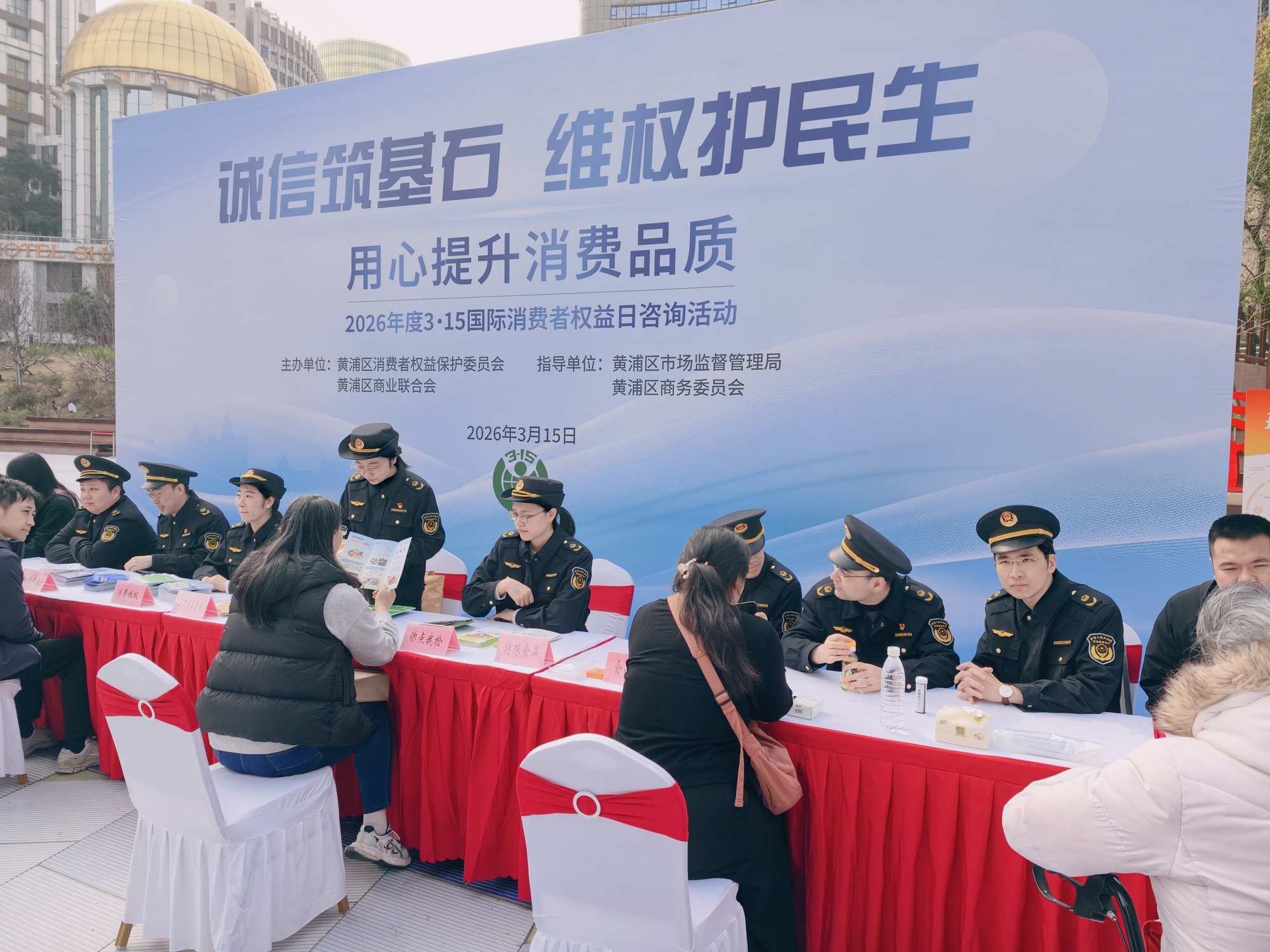 3月15日上午,在南京路步行街世纪广场上的一台橙擎机器人正灵活地挥动机械臂,向围观的人群挥手致意。这不是科技展,而是区市场监管局、区商务委与区消保委主办的2026年“3·15”国际消费者权益日主题活动现场。